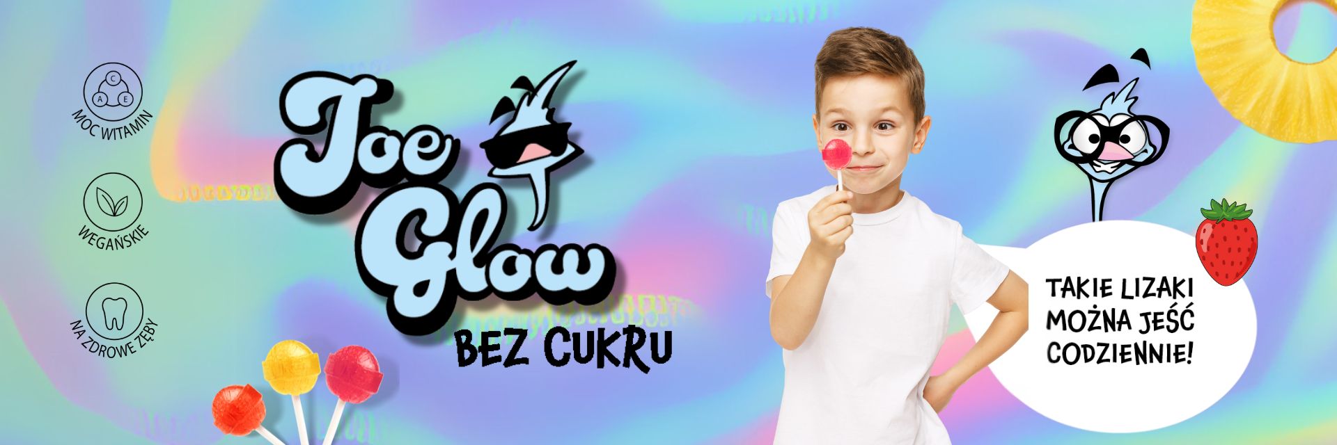 Joe Glow to polska marka, która powstała z myślą o dzieciach i ich zdrowiu. Produkujemy bezcukrowe lizaki i słodycze, które nie tylko nie szkodzą zębom, ale wręcz wspierają higienę jamy ustnej. Pomagają utrzymać prawidłowe pH oraz remineralizują szkliwo dzięki takim składnikom jak izomalt i erytrytol. Nasze produkty są odpowiednie także dla diabetyków. Nie zawierają glutenu, laktozy, konserwantów ani barwników pochodzenia zwierzęcego.